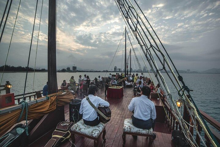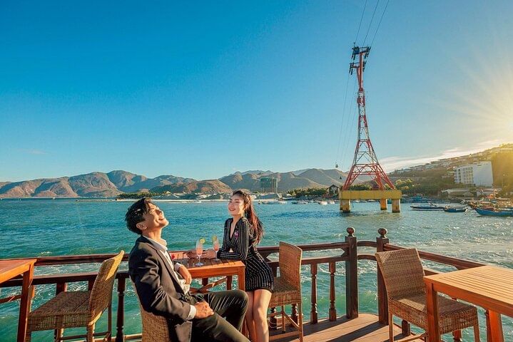Embark on a magical evening aboard a traditional Vietnamese junk boat with your Nha Trang sunset dinner cruise. Your experience begins with convenient hotel pickup before we set sail on Nha Trang Bay, just as the sun begins to set. As you watch the sky transform into brilliant shades of orange and pink, you can relax with a refreshing cocktail or other beverages. Live music fills the air as you take in the beautiful sights and the city lights sparkling around you. You’ll then be treated to an exquisite 5-course dinner, featuring fresh local ingredients and a delicious lobster dish. To end your perfect night, you can mingle with fellow travelers on deck with a final drink under the stars.